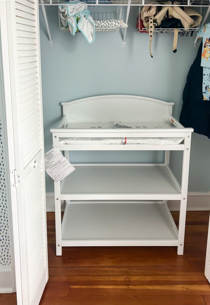 I have been helping my younger daughter, Mandy set up a nursery for my newest grandson. Once we got the nursery walls painted, wallpaper hung, rug and furniture in place it was time to get all the “baby things” organized.